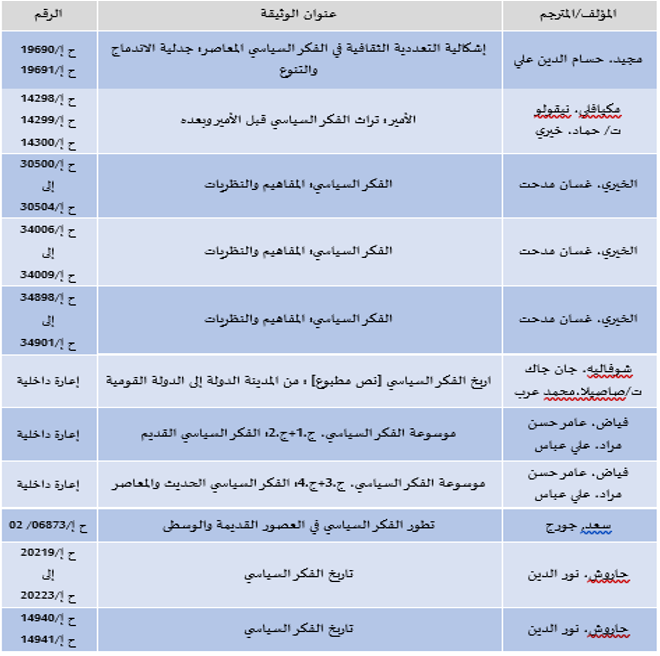 تم وضع فقط الكتب التي تندرج ضمن المراجع المباشرة لمادة تاريخ الفكر السياسي، سواءً من فهرس المكتبة المركزية أو الانترنت. كما يُمكن إيجاد عدد كبير جدا من الكتب التي قد تتعرض لموضوع جزئي أو لا يحتوي العنوان على عبرة الفكر السياسي، مثل تاريخ النظريات السياسية، الفلسفة السياسية، تاريخ المذاهب...إلخ
